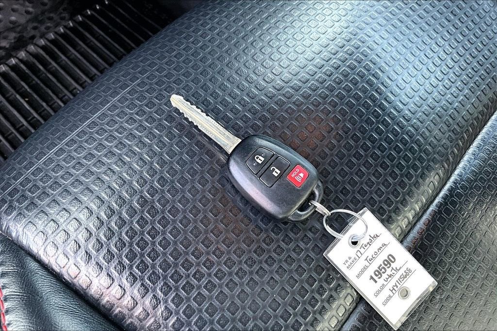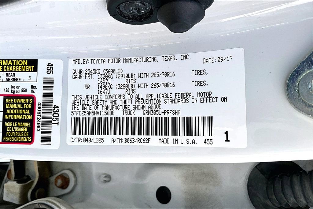 Finished in Super White, this Tacoma TRD Pro features exclusive exterior upgrades including the signature black TOYOTA front grille, black hood scoop with graphic, Rigid Industries LED fog lights, and 16inch TRD black alloy wheels wrapped in P265/70R16 allterrain tires. Practical exterior features include projectorbeam headlights with LED daytime running lights, a 5foot composite bed, deck rail system with four adjustable tiedown cleats, a 120V bedmounted power outlet, and an easylower, lockable, removable tailgate. Factory and dealerinstalled accessories listed on the original window sticker include Predator tube steps, allweather floor liners, bed mat, mudguards, wheel locks, and door edge guards.