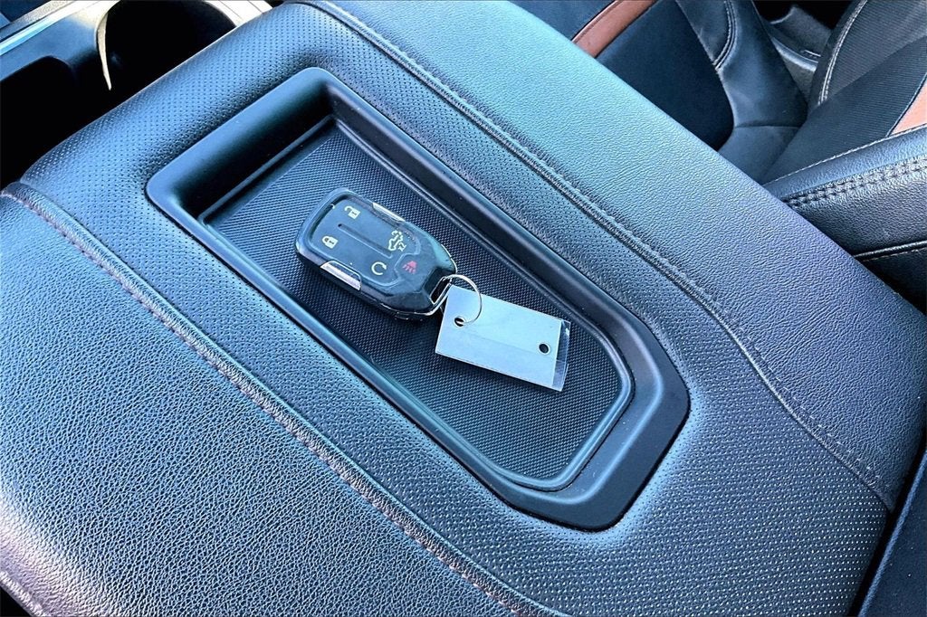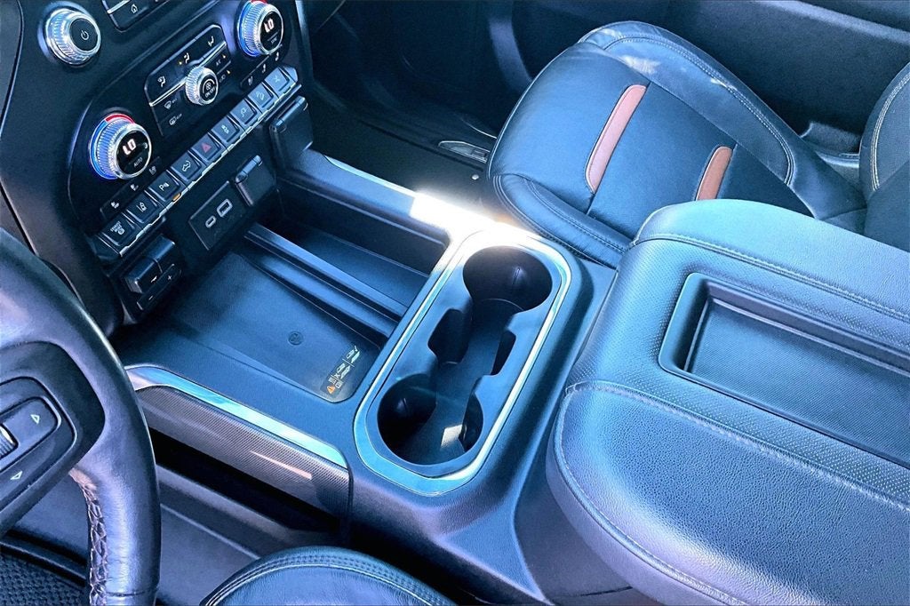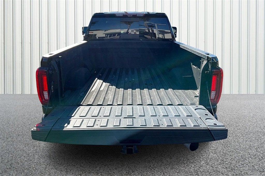 On the exterior, the truck stands out in Onyx Black, equipped with 20 high-gloss black wheels, power-retractable assist steps with LED lighting, LED reflector headlights, LED fog lamps, LED cargo lighting, red recovery hooks, rear wheelhouse liners, and the versatile GMC MultiPro tailgate. A factory spray-on bedliner with AT4 logo and stamped bed holes with caps from the Gooseneck/5th Wheel Package make this truck tow-ready right from the factory.
